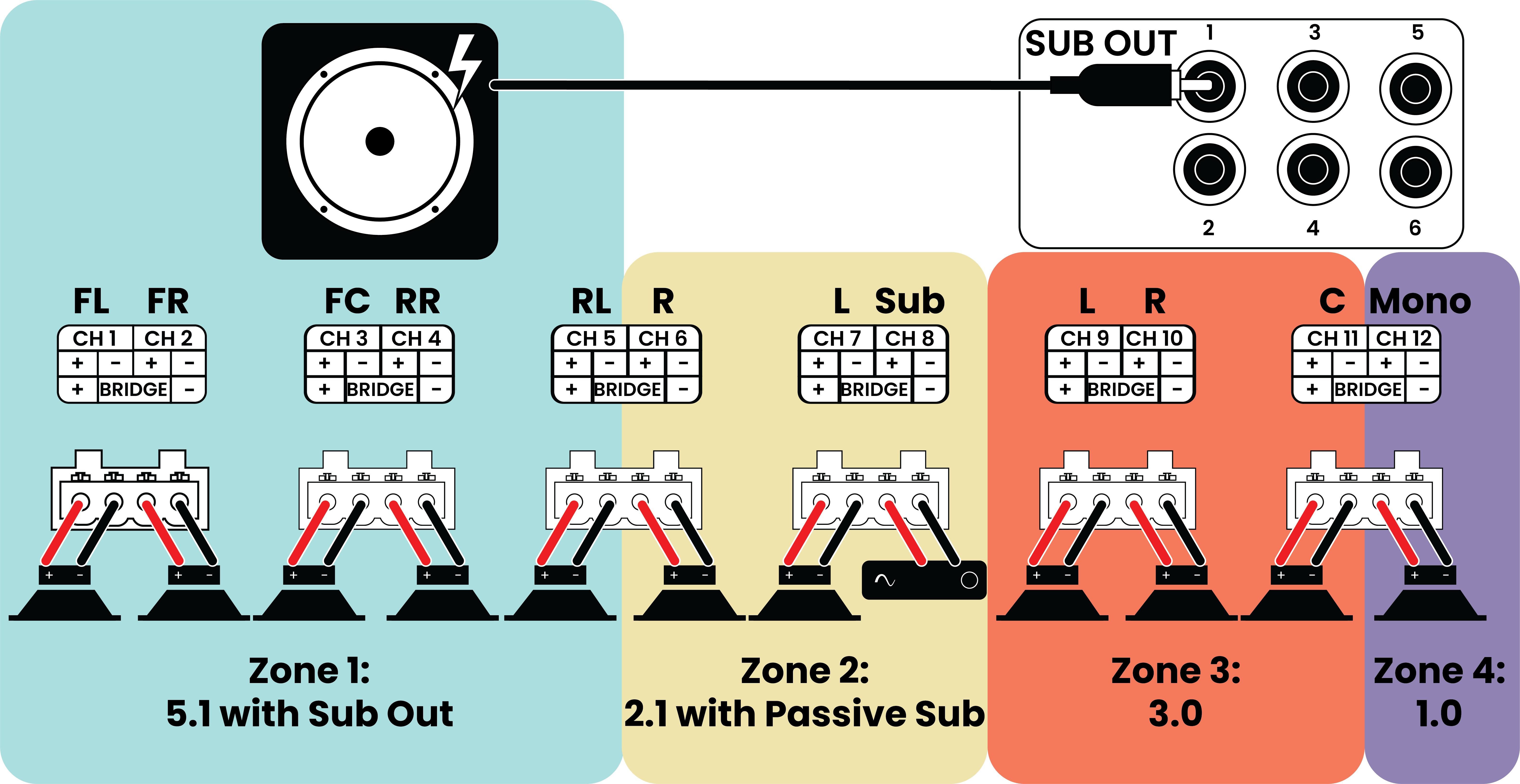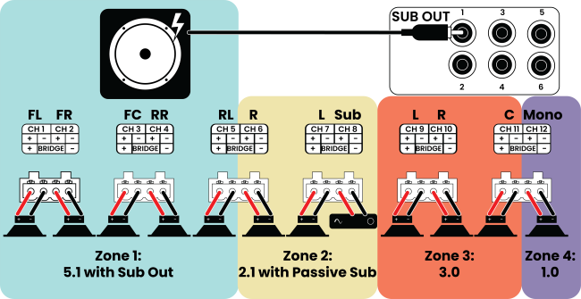 Note: The Sub Out number corresponds to the zone number. For example: For the second zone configured (Zone 2), the subwoofer connects to Sub Out 2.)
