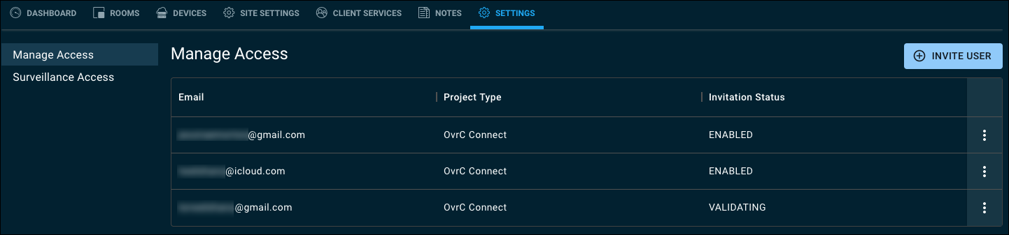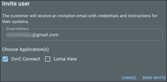 Click the Invite User button to invite someone to OvrC Connect, Luma View, or both.