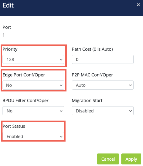 Caution: Disable Edge Port if you change the connected device on the switchport. Failure to do so may cause a switching loop.