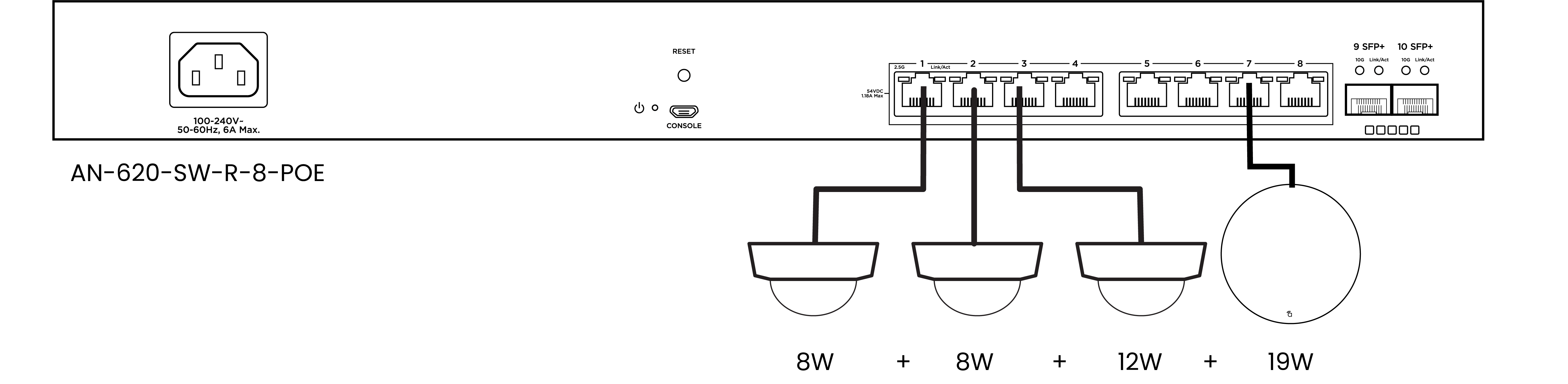 The PoE budget (Power over Ethernet) limits the amount of power available to all ports, with a maximum of 60W on an individual port. Add the total number of possible watts that the connected devices can consume to make sure everything can receive power reliably. See the example below.