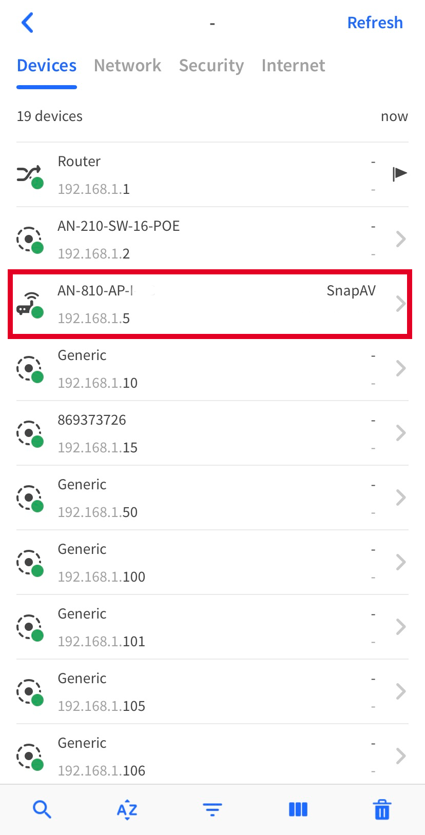 Use a network scanner (e.g. Fing) to scan the network. The Araknis switch manufacturer field displays SnapAV.