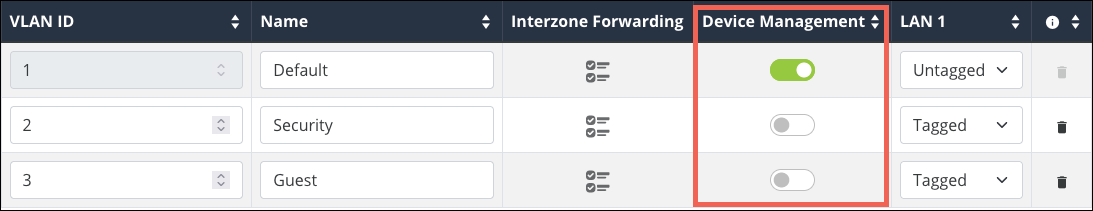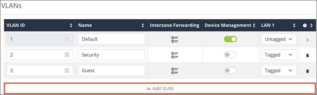 icon to configure Interzone Forwarding (previously InterVLAN routing). This allows communication between client devices connected to the VLANs. Do not use this feature if security between VLANs is a concern.Select which VLANs to forward data TO, and the VLANs to receive data FROM. Then click Apply.