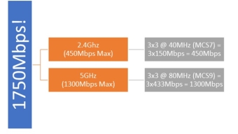 The advertised speed for this product is 1750 Mbps. Pretty great when you have 450 Mbps coming from the ISP, right? Before you get excited, let's break down how manufacturers got the 1750 Mbps number. The math is simple: we have 3 streams on 2.4 GHz and 3 streams on 5 GHz radio interfaces. Per 802.11ac standards, on 2.4 GHz radio, when a device establishes a connection with the access point using 40 MHz channel bonding (MCS7), then the stream maximum throughput is 150 Mbps. We have 3 streams on 2.4 GHz, so this equals 450 Mbps on the 2.4 GHz radio. Similarly (again per 802.11ac standard), when a device establishes a connection with the access point using a 5 GHz radio and 80 MHz channel bonding (MCS9), then the stream maximum throughput is 433.3 Mbps (5 GHz has more throughput than 2.4 GHz). We have 3 streams on 5 GHz, as well, so this equals 1300 Mbps on 5 GHz. Now, since the access point is dual-band concurrent, combine the maximum speeds on both interfaces and voila! We have 450 Mbps + 1300 Mbps = 1750 Mbps!