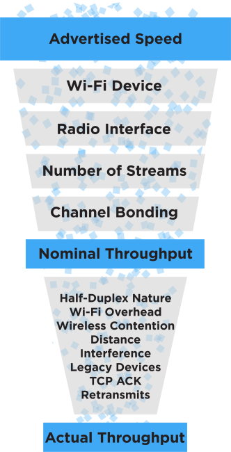 So, what does that mean to the effective real-life throughput? In order to answer that, we have to flip the perspective of the above figure to be from the client device trying to connect to an access point. All the aspects listed below dramatically affect the throughput of the device: