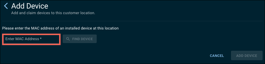 On the next page, enter the device's MAC address and click Find Device. For Snap One devices, the address is on a sticker on the outside of the box.