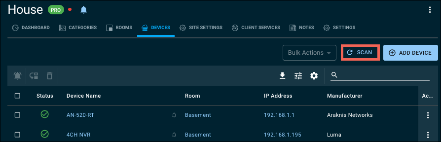 You can start an OvrC Pro scan by going to the Devices list and clicking the Scan button at the top of the device list.