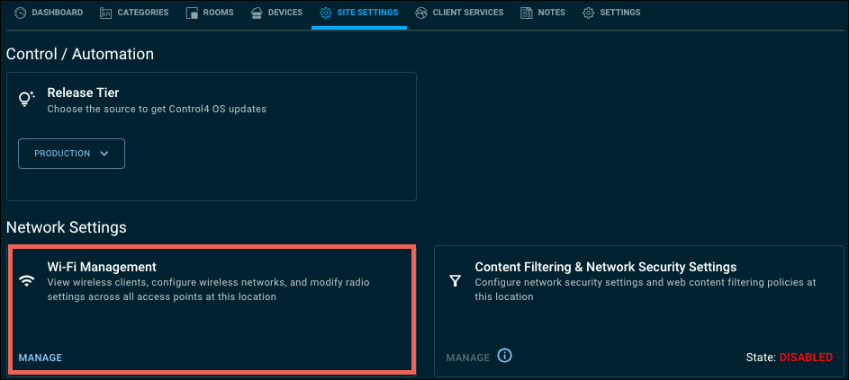 Select a Customerand go to the Site Settings tab, then Wi-Fi Management under Network Settings. Then click Manage.