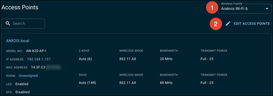 You can continue adjusting the rest of the APs from the Networks & Access Points tab using the dropdowns. If you’re configuring a Wi-Fi 6 AP, you can also enable or disable the DFS channels and the AP’s LED.