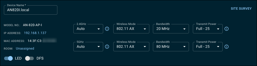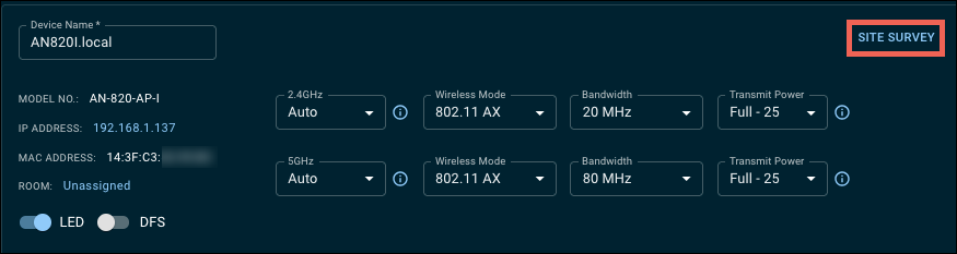 Note: Site Survey is only available on Araknis x20 Series access points. Wi-Fi 5 APs have a site survey tool in their local UI.