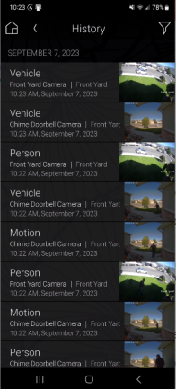 While notifications for vehicle, person, and package detection events are disabled by default, these events are shown in the History agent in the Control4 app (named Vehicle, Person, Package Detected, and Package Removed). The events contain a short video clip of what they have detected. Events are saved for up to 7 days (or up to 100,000 rolling records).