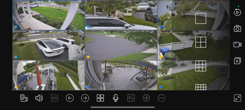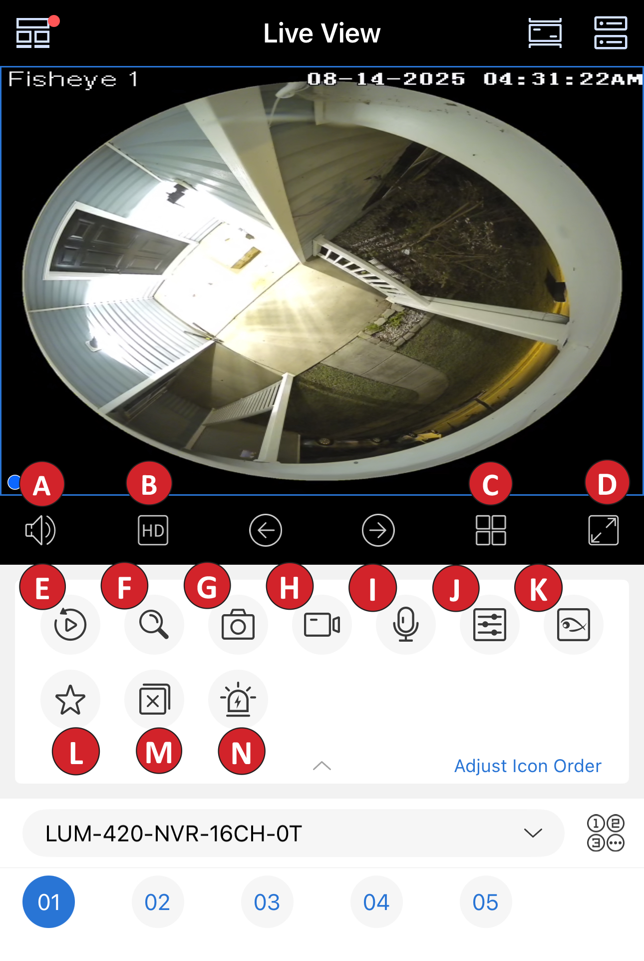 From any multi-camera view, double-tap a camera tile to expand to single camera view. Tap the drop-down menu to see extra icons. Tap Adjust Icon Order to customize icon layout.