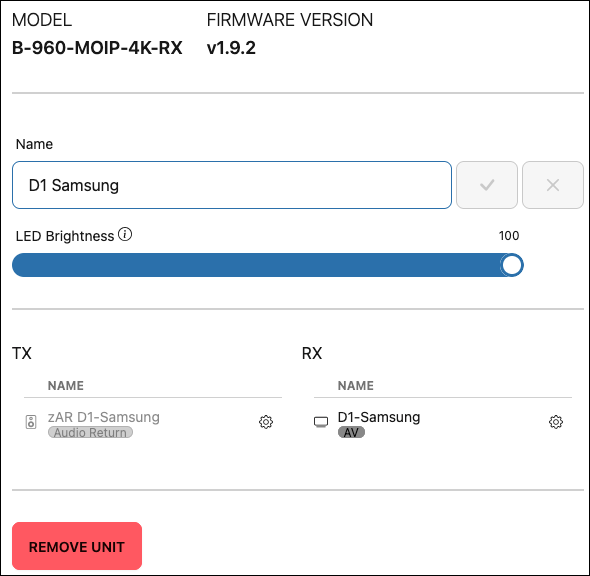 Use the Settings button at the top of the tile to edit the Name, adjust the LED Brightness, or Remove the Unit from the system configuration. Click the Settings icon next to the TX or RX for the device-specific Settings.