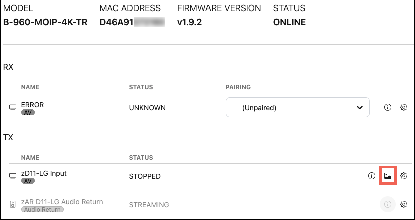 Use the Settings button at the bottom of the tile, next to the TX or RX, to adjust the device-specific settings. There's also an Information icon to display data about the stream. TXes have a