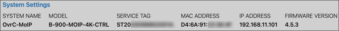 The System Settings at the top of the page display hardware information for the MoIP controller.