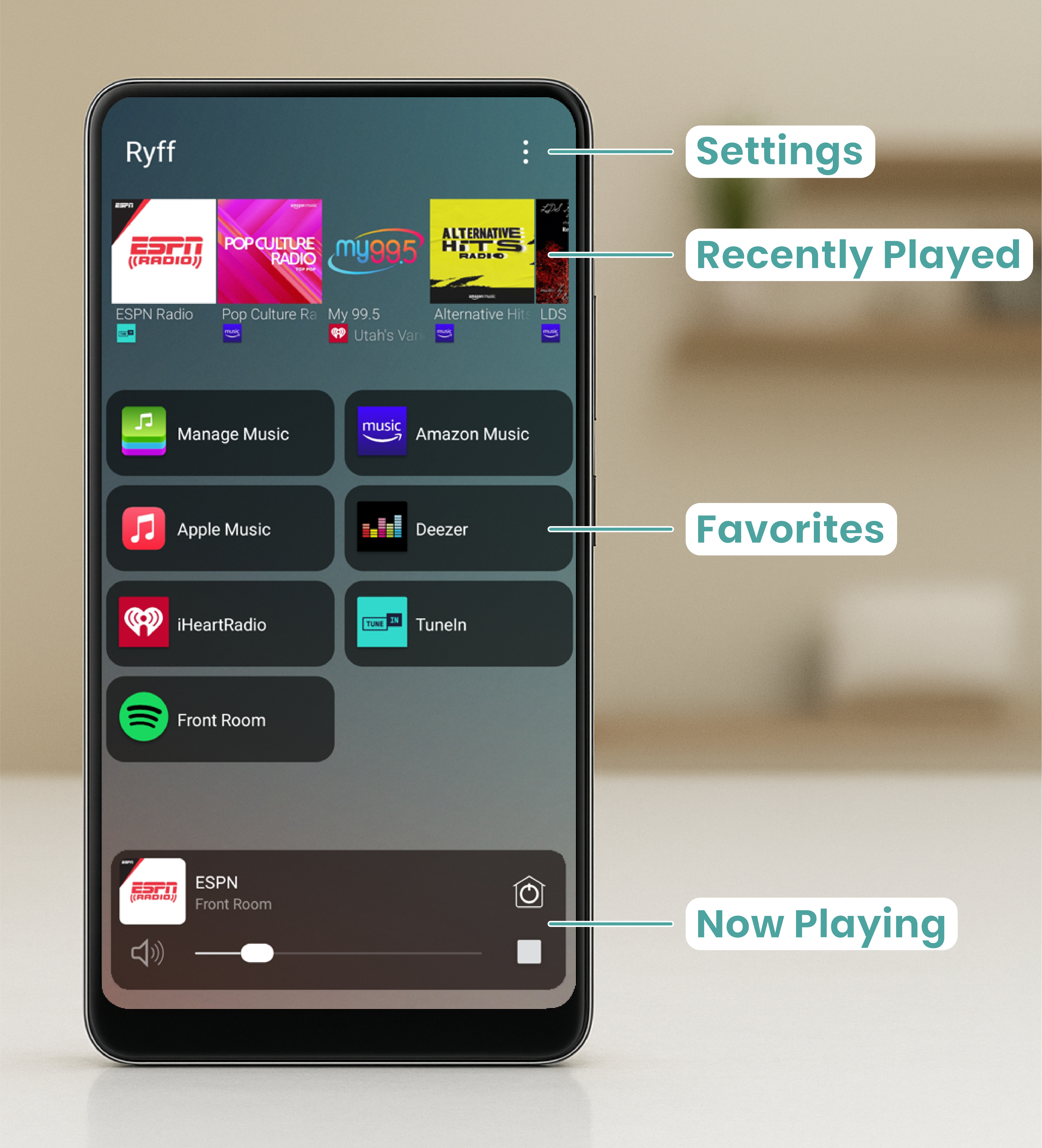 On the Ryff Home Screen, you can choose from Recently Played sources, Favorite sources, playlists, and devices, and control the music in the Now Playing section.
