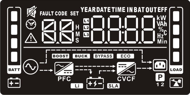 Displays the input voltage, input frequency, input current, battery voltage, battery current, battery capacity, ambient temperature, output voltage, output frequency, load current and load percentage. k: kilo, W: watt, V: voltage, A: ampere, %: percent, ℃: centigrade degree, Hz: frequency |